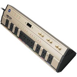 Tripp Lite HTPOWERBAR10 Isobar Home/Business Theater Surge Suppressor provides ultimate protection--5700 joules--stopping damaging surges and filtering disruptive line noise so components perform at their peak! You can see and hear the difference: sharper, crisper video; deeper, fuller audio and longer component life spans. Perfect for large home/business theater installations: high-definition TVs, PVRs, satellite and A/V receivers, subwoofers, DVD/CD players and more. Exclusive Isolated Filter Banks eliminate noise interference between components. 10 outlets (with transformer spacing and plug-in safety covers), 3-line coaxial protection and 1-line tel/modem protection safeguard an entire home/business theater system. $500,000 Ultimate Lifetime Insurance coverage with Data Recovery Warranty (USA and Canada only). Includes metal housing, color-coordinated outlet/plug labels, 16 diagnostic LEDs, 8 ft. cord with a right-angle plug, two 6 ft. gold coaxial cables and 6 ft. phone cord. 10 surge-protected NEMA 5-15R AC outlets safeguard an entire business or home-theater system 1-line tel/modem surge protection (with included 6 ft. phone cord) safeguards personal video recorders (PVRs) on a single dial-up line. Built-in splitter (1 jack in and 2 jacks out) allow simultaneous connection of two devices sharing a single line 16 diagnostic LEDs alert user to 6 input voltage levels, 6 amp usage levels and 4 operational conditions (protection, grounding, power, switched status) Keyhole slots provide convenient wall or cabinet mounting